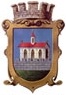 EN: Azure, standing on a base Vert a wall masoned and embattled; behind it a church with three arched windows on the front and an opened door at the sinister; the gabled roof Gules is topped on both ends with a knob and crosslet Or, in the center a hexagonal steeple with a roof Gules and a window, topped with a knob and crosslet Or. The shield with an ornamented border of Bronze colour and a mural crown with five visible embattlements Argent.