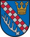 DE: In Blau ein von Rot und Silber doppelreihig geschachter Schrägbalken; oben eine goldene, alte Königskrone mit silbernen Perlen in den Blättern, unten eine silberne, schräggestellte Hirschstange.