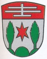 DE: Unter rotem Schildhaupt, darin ein doppelarmiges silbernes Kreuz mit Fußbalken, in Silber zwei aus den äußeren Kuppen eines grünen Dreibergs wachsende pappelartige grüne Bäume, dazwischen ein sechsstrahliger roter Stern.