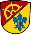 DE: Schräglinks geteilt von Rot und Gold; oben ein schräg links gestelltes, halbes, mit silbernen Messern besetztes goldenes Rad, unten eine blaue Lilie.