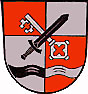 DE: Über einem von Silber und Rot gespaltenen, oben mit einem von Schwarz und Silber gespaltenen Wellenbalken begrenzten Schildfuß, geviert von Rot und Silber, belegt mit einem schräggekreuzten silbernen Schlüssel und einem schwarzen Schwert.