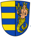 DE: Gespalten; vorne fünfmal geteilt von Gold und Blau; hinten in Blau eine golden gekrönte natürliche Meerjungfrau mit goldenem Fischschwanz und goldenen Haaren, in den Händen drei goldene Ähren haltend.